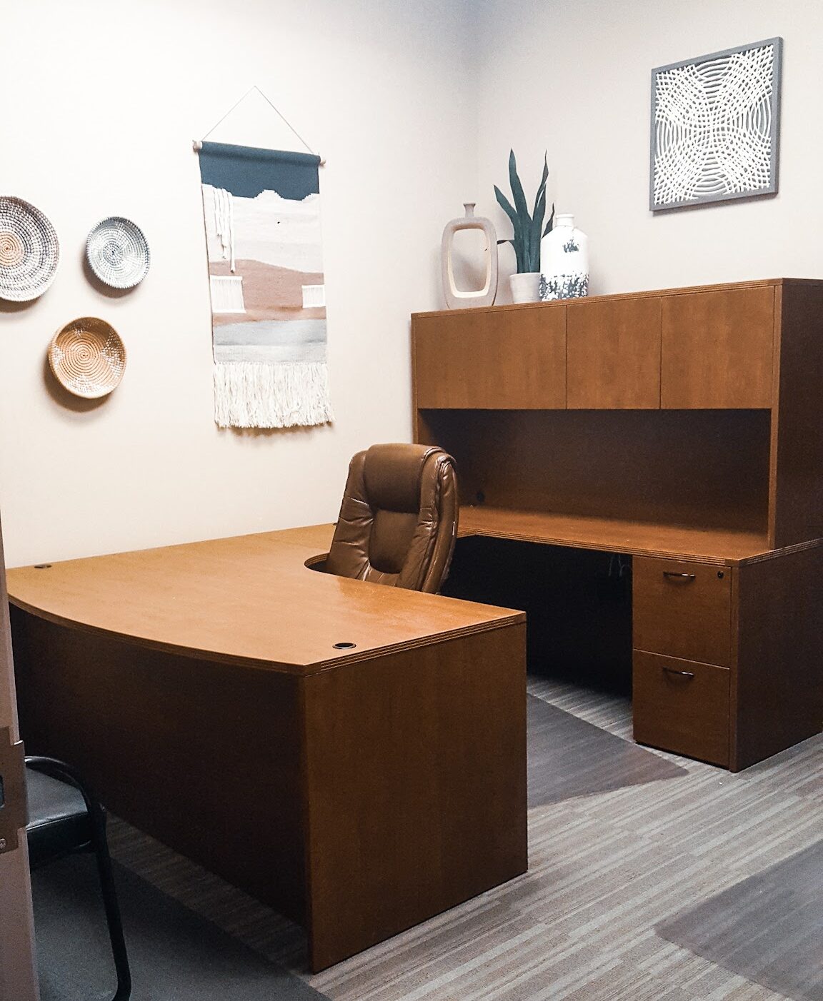 Office No. 5 Is a corner office with two beautiful windows; one north, and the other east facing. It’s the closest to the back door for quick in and out. It is a single-person executive suite furnished with an executive desk and bookshelf with two guest chairs. This cozy office is ready for you to set up and get to work.
